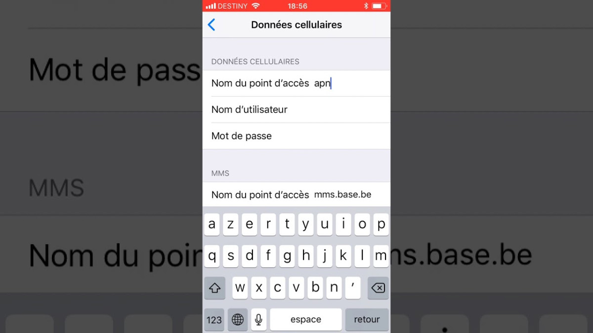 - Cliquez sur APN et remplissez : apn.destiny.be